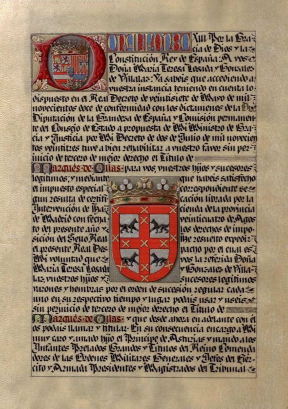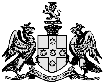 SUPPORTERS: On either side an angel ppr., vested arg., zoned and on the head an eastern crown or, the dexter holding in the exterior hand a balance gold and in the other a book ppr., the sinister bearing in the exterior hand an olive branch and in the other an escroll ppr.,