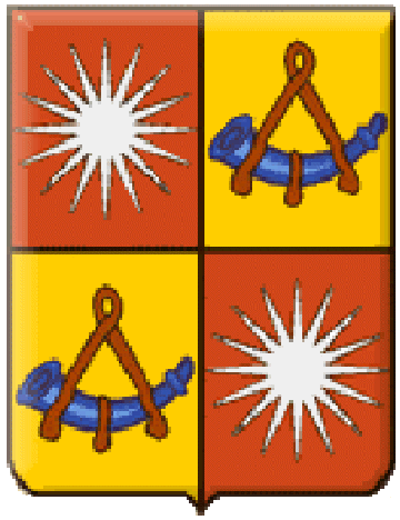 BLAZON:....Argent (silver), a chevron Gules (red), in base an oak wreath Vert (green), tied Azure (blue), on a chief of the second (i.e., red), three mascles of the first (i.e., silver).