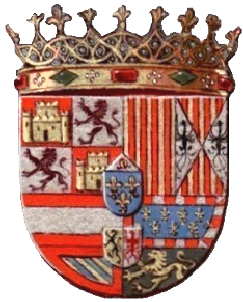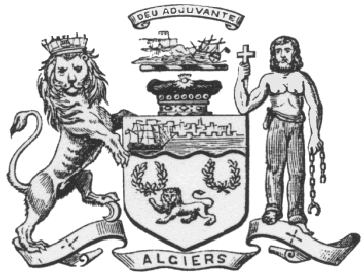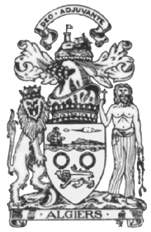 BLAZON:....Gules (red), a lion passant guardant and in chief two chaplets of laurel Or (gold), on a chief of augmentation, wavy Argent (silver), a representation of Algiers with a British man-o-war before it, flying the flag of an Admiral of the Blue, all Proper (natural colour).