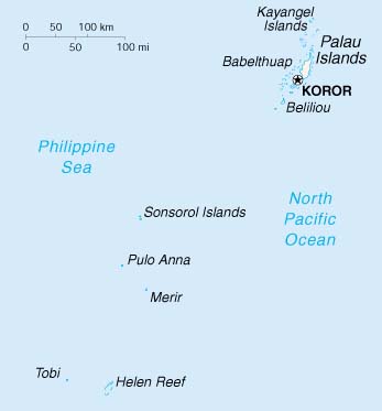 Palau, Republic of (or Belau, formerly Pelew or Pellew Islands), archipelago (26 main islands) in Pacific e. of Philippines, part of w. Caroline Islands; 188 sq mi (487 sq km); cap. Koror; copra, sugar, breadfruit, bananas; bauxite, phosphates; discovered by Spanish 1543; sold to Germany 1899; made Japanese mandate 1919; became headquarters for entire Japanese South Seas government; naval and air base in World War II; occupied by U.S. 1944; made U.S. trusteeship 1947; internally self-governing 1980; granted total independence 1994; pop. 15,105