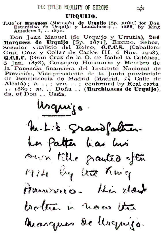 Luis de Urquijo y Ussia, 1st Marqués de Amurrio (created 1914), b. 1887 d. 1956, younger son of the Juan Manuel de Urquijo y Urrutia, 2nd Marqués de Urquijo and María Dolores Ussía y Aldama, m. 1909 María Teresa de Losada González de Villalaz, Fernández de Liencres y Fernández de Velasco, Marquesa de Zarreal dau. of the Marqueses de los Castellones (Grande de España), b. 29 Mar. 1886 Madrid d. 196_ and had issue.