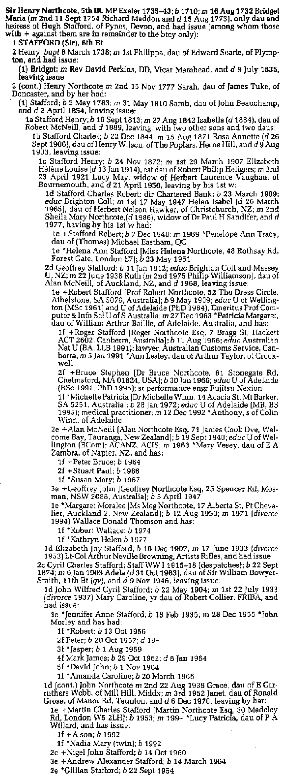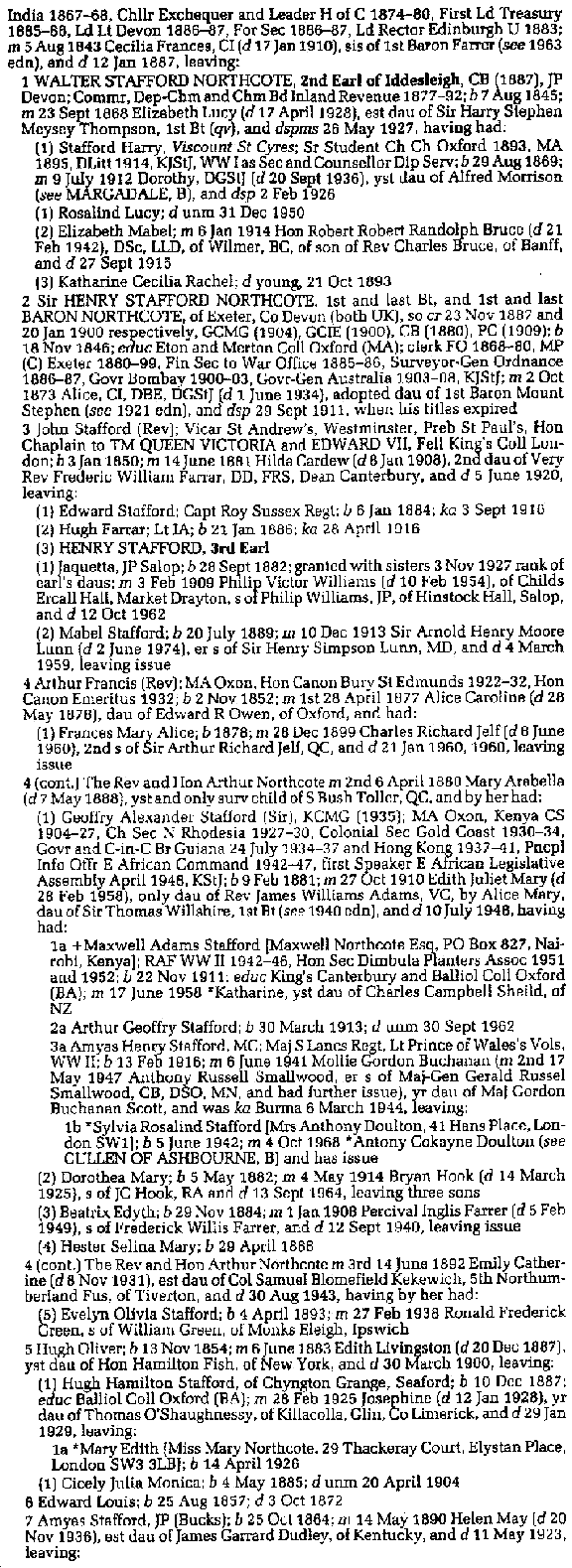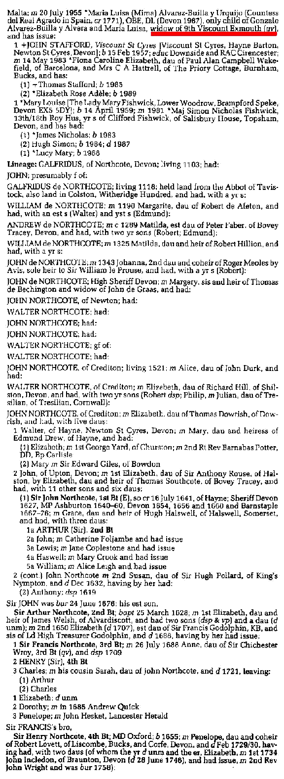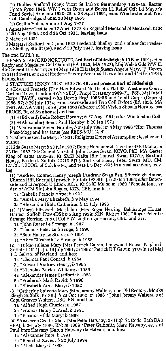 STAFFORD HENRY NORTHCOTE, 4th Earl of Iddesleigh and Baronet; b. 14 July 1932. d. 8 July 2004; s 1970; of Shillands House, Upton Pyne Hill, Exeter, Devon; educ. Downside; late 2nd Lt Irish Gds; D.L. (Deputy Lord Lieutenant) Devon 1979; Knt of Honour and Devotion Sovereign Mil Order of Malta; m. 1955 Maria Luisa (Mima) Alvarez-Builla y Urquijo (Condesa del Real Agrado, in Spain cr. 1771) b. 22 April 1934, O.B.E., (Order of the British Empire) D.L. (Deputy Lord Lieutenant) Devon 1987, only dau. of late Don Gonzalo Alvarez-Builla y Alvera and of Maria Luisa Urquijo y Losada (Marquésa de Olías, in Spain cr. 1652; s. 1940), Viscountess Exmouth, (see Pellew/Exmouth ) and has issue,