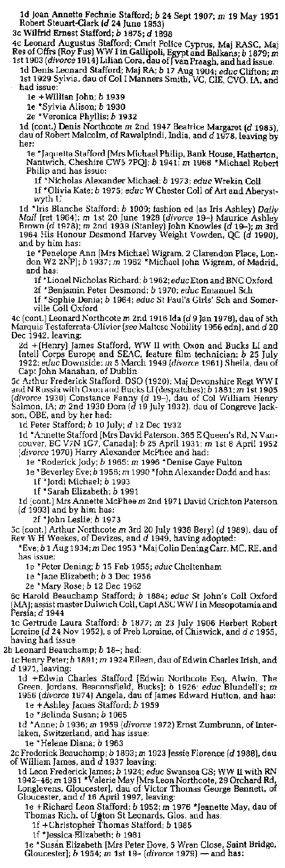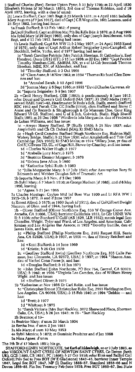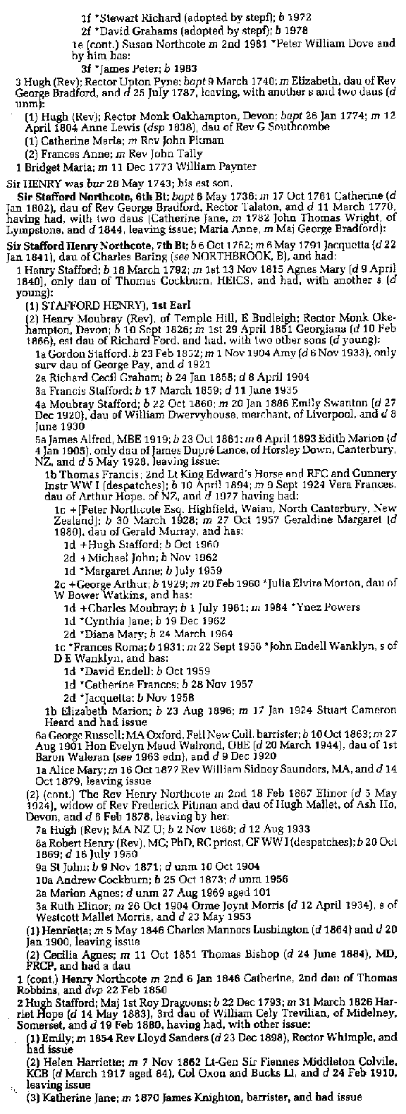 1... JOHN STAFFORD NORTHCOTE, 5th Earl of Iddesleigh and Baronet; b. 15 Feb 1957; educ. Downside and Roy Agric Coll. Cirencestor; m. 14 May 1983, Fiona Caroline Elizabeth, dau. of Paul Alan Campbell Wakefield, of Barcelona, Spain and Mrs C.A. Hattrel of Burnham, Bucks and has issue,
